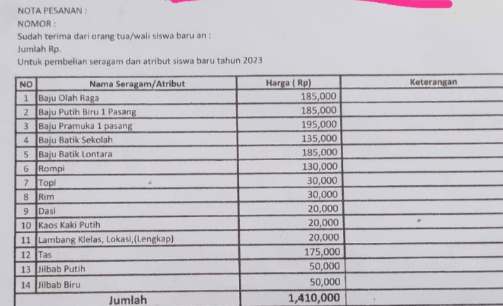 Jumlah Administrasi seragam sekolah SMPN 14 Buat Shok para Orang tua Siswa.