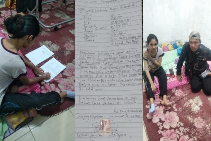 Dengan surat pernyataan korban “massyura” tersebut, di bubuhkan di atas materai Rp.10.000 rupiah. Berlambangkan burung garuda republik indonesia, menyebutkan pernyataannya itu. “Saya yang bertanda tangan di bawah ini, nama. Massyura, nomor induk kartu (nik). 113035911030001, tempat tanggal lahir. Idi, 19/11/2023. Agama Islam, pekerjaan. Belum bekerja, warga kecamatan idi rayeuk kabupaten aceh timur. Menyatakan, bahwasanya benar adanya rilis berita dari wartawan tabloid putra pos. Jurnalis kasmidi panjaitan, yang di beritakan kepada wartawan media online gabungnyawartawanindonesia.co.id. Media online detektifinvestigasi.com, yang jurnalisnya berinislal R.K.P.